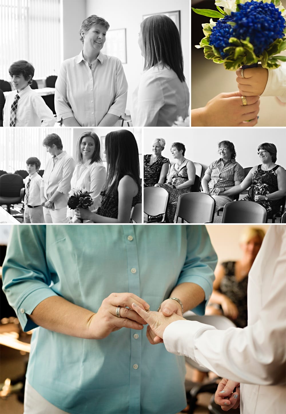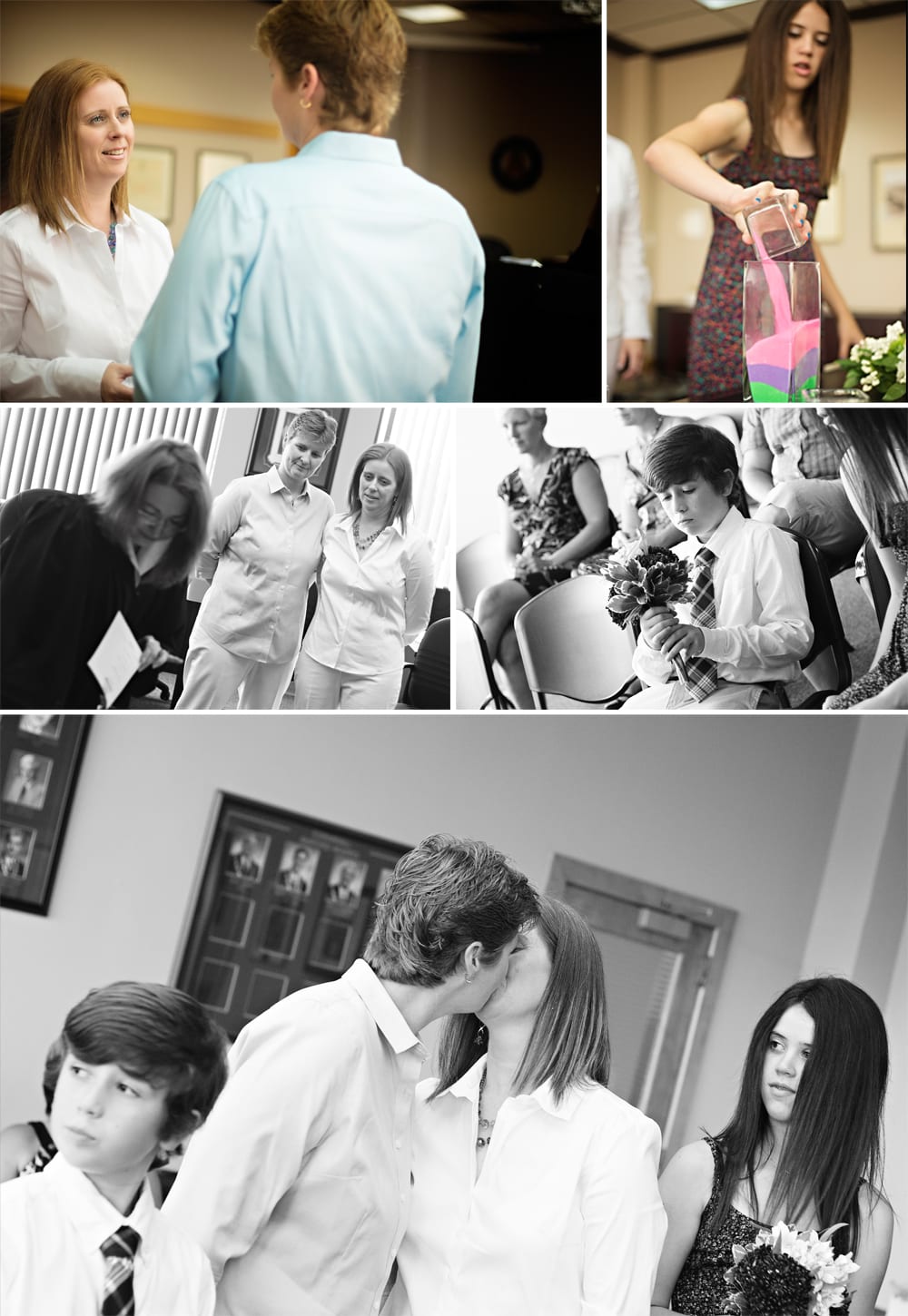 Lisa and Nicky have two kids who were VERY excited about the day’s event. A quiet conversation while I was getting the two of them into position was all it took for them to be beaming with pride over their “new” family. With four friends serving as witnesses, we all headed over to city hall, where I think the city clerk was more nervous than anyone else. It turns out that this was her first wedding. What a fun start to a new role! The ceremony was sweet and simple, but there was no mistaking the importance that it played to all four members of this family. Unity sand made a nice touch and got the kids involved, as did giving Hailey a bouquet to hold.