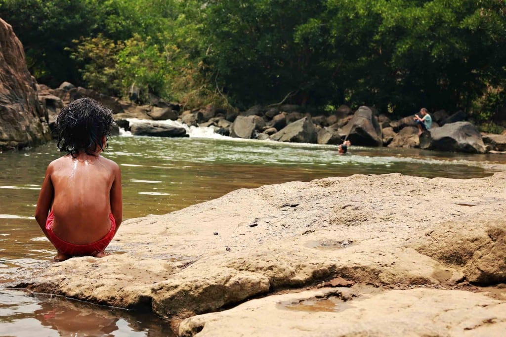 After running to catch up with a young local girl taking her friends out for joyrides using Dad’s motorbike and side cart and then pretending to climb in (which caused a great deal of confusion and gradual smiles), we set off to explore two of the local cascades. We had a good time clambering around on the rocks along the edge of the water while we tried to decide where to swim. Clearly, this wasn’t the place; there were a number of children around, but they were either fishing or playing under water trickling through the rocks in mini-waterfalls. If it’s a good spot to swim, you can be guaranteed the local kids will be in there. The temperature is consistently in the very high thirties and, we suspect, will be climbing into the forties on a regular basis now, so taking advantage of water when it’s available is essential. We walked upstream and found a number of local children swimming in the plateaus amongst the second set of cascades, so we decided to join them to cool off. We deposited our stuff along the water’s edge and slid (quite literally and very definitely without grace) into the water on algae-covered rocks – rather comical for the locals, I’m sure. It is at this point that things went wrong for us, but we wouldn’t know for another twenty minutes or so.